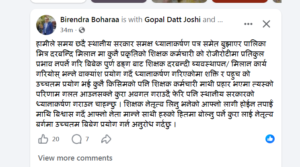 ‘हामीले समय छदै स्थानीय सरकार समक्ष ध्यानाकर्षण पत्र समेत बुझाएर पालिका भित्र दरबन्दि मिलान मा कुनै प्रकृतिको शिक्षक कर्मचारी को रोजीरोटीमा प्रतिकुल प्रभाव नपर्ने गरि बिबेक पुर्ण ढङ्ग बाट शिक्षक दरबन्दी ब्यवस्थापन÷ मिलान कार्य गरियोस् भन्ने वाक्यांश प्रयोग गर्दै ध्यानाकर्षण गरिएकोमा शक्ति र पहुच को उच्चतम प्रयोग भई कुनै किसिमको पनि शिक्षक कर्मचारी माथी प्रहार भएमा त्यस्को परिणाम गलत आउनसक्ने कुरा अवगत गराउदै फेरि पनि स्थानीय सरकारको ध्यानाकर्षण गराउन चाहन्छु । शिक्षक नेतृत्व लिनु भनेको आफ्नो लागी होईन तपाईं माथि बिश्वास गर्दै आफ्नो नेता मान्ने साथी हरुको हितमा बोल्नु पर्ने कुरा लाई नेतृत्व बर्गमा उच्चतम बिबेग प्रयोग गर्न अनुरोध गर्दछु’ शिक्षक संघका नेता बिरेन्द्र बोहराले सामाजिक सञ्जालबाट सार्वजनिक गरेका छन् ।